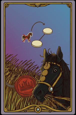This "Atticus" Royal Writ Mandate card lets you halt the horse's movement during the Queen's Move Action. Her pawns still move towards the stalled horse if possible. Return the card to the bottom of the Royal Writ deck after use.