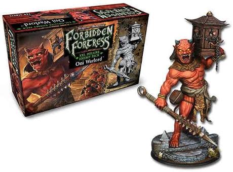Feared throughout the land, the great giant, Akuma Oki, is a brutal Oni Warlord. Carrying a massive, wooden cage on his shoulder, he raids villages and farms to collect slaves, for food and to work in his Dark Stone mines! Worshiped as a god by the Nobuhara Clan, they drive his massive slave armies to fight and die for the black rock! This XXL Deluxe Enemy Pack is themed for the Forbidden Fortress World and includes the massive Oni Warlord miniature, Enemy Record Sheet, 2 new Missions, and a host of new cards to add to your games of Shadows of Brimstone.