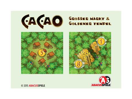 Cacao: Big Market & Golden Temple, which was contained in day 17 of the Brettspiel Adventskalender 2015, is a set of two jungle tiles that replace two specific tiles in the base game (one 3 value market and one regular 6/3 temple).