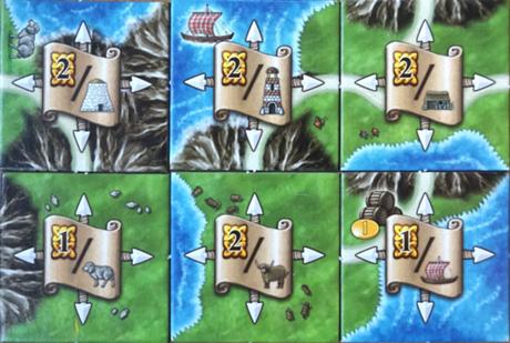 This small expansion consists of six tiles to be added to the tile mix. Each of the tiles contain a scroll that scores features only on adjacent tiles. Theses special scrolls are marked with arrows.